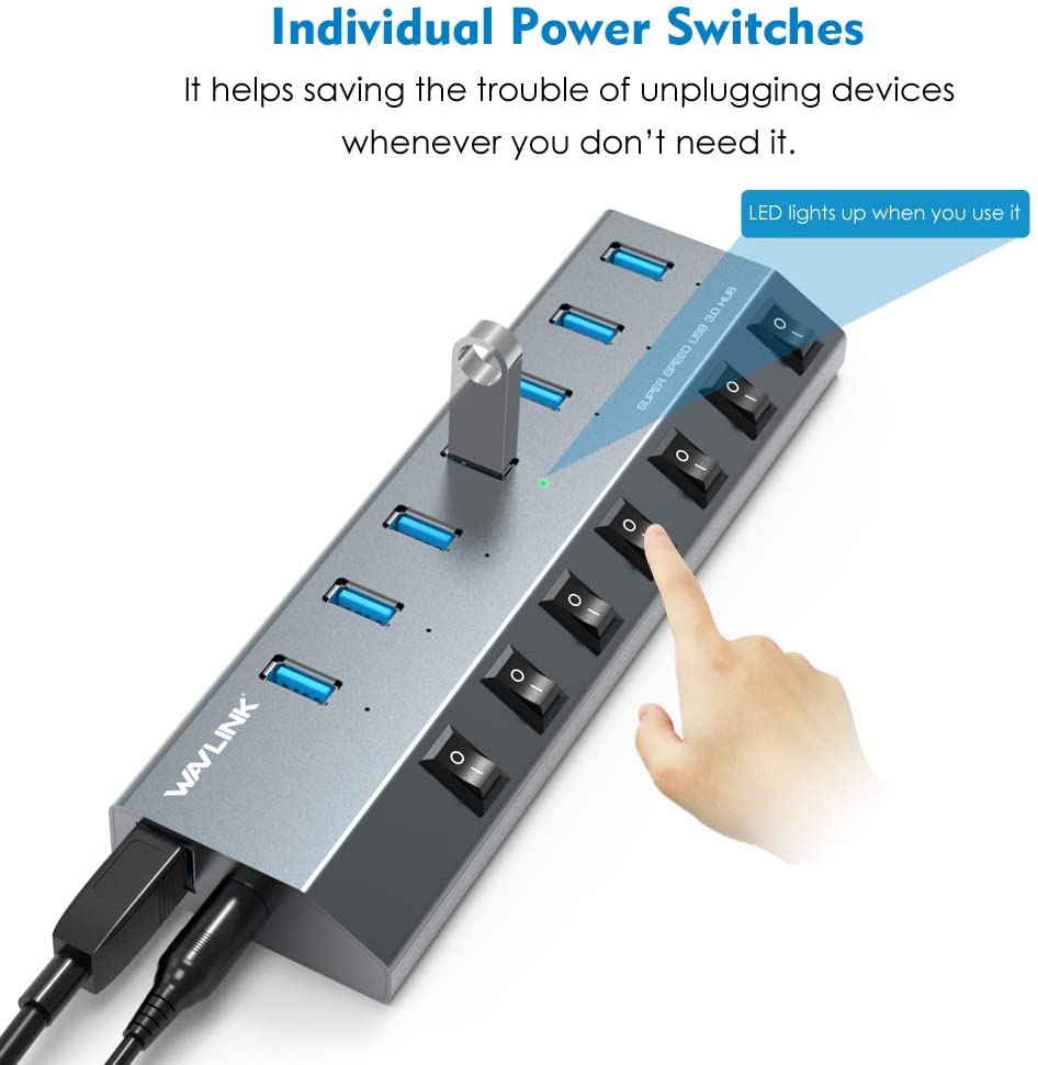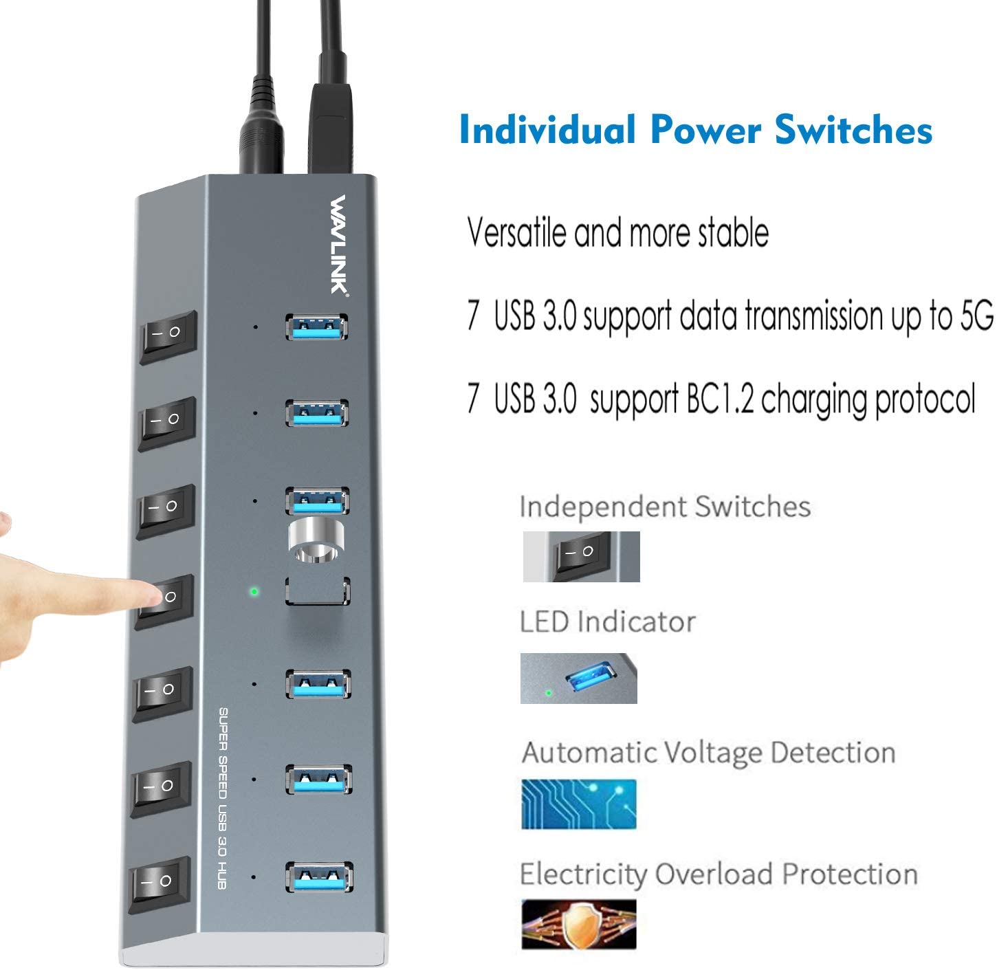 Powered USB Hub 3.0, WAVLINK 7 Port 48W Charging Slim USB 3.0 hub Powered, 5V/2.4A with Individual On/Off Switches LED Indicator