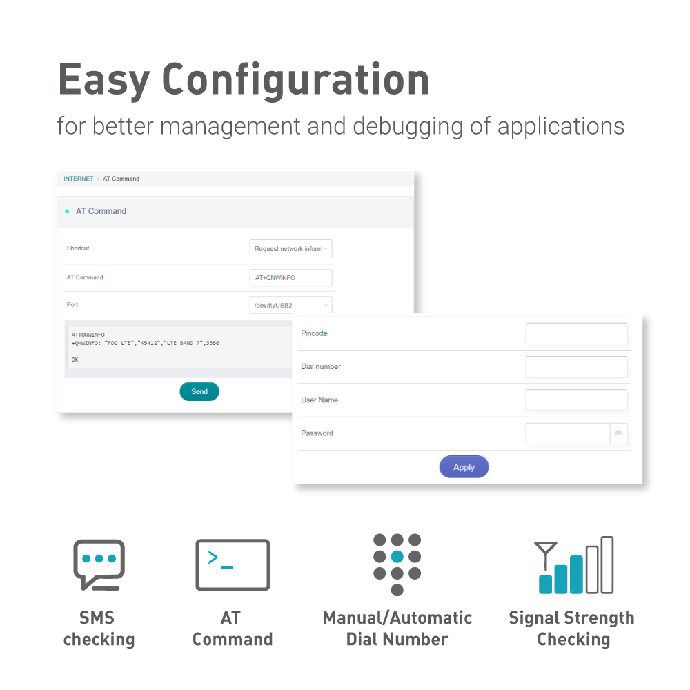 • Easy Configuration with New Web UI 3.0: The built-in 4G modem supports AT command, manual/automatic dial number, SMS checking, and signal strength checking for better management and configuration.