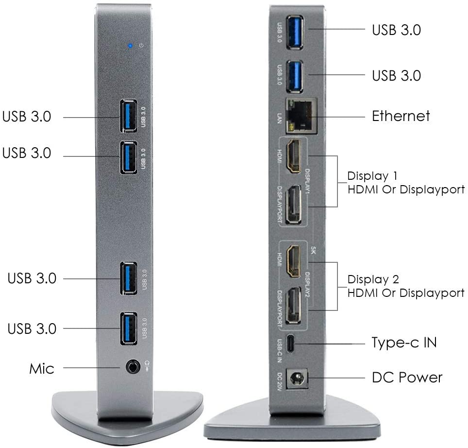 • USB C Universal docking stations turn the USB port of a computer into a docking station connector. A dock, connected to your computer by a single USB cable, can support dual 4k@60Hz & single 5K@60Hz displays, audio, Gigabit Ethernet and 6 USB 3.0 peripherals. NO PD CHARGING.